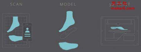 SOLS客戶可以使用手機等設備對自己的腳部進行掃描,然后在app上下訂單,SOLS的團隊獎掃描數據轉換成3D模型,再據此為客戶定制鞋墊并使用3D打印機打印出來。