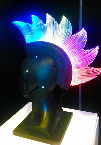 當然,使用3D打印這種要求極高的頭盔同樣需要復雜的設計和操作,特別是需要保證其耐用性,確保在整個巡演過程中不出任何差錯。在這個頭盔中,設計師使用了兩種打印技術,FDM和PolyJet。在頭盔類似雞冠的部分使用了FDM打印技術,材質為ABS-M30FDM熱塑性材料,FDM技術可以將所有部件固定在一起;里面部分則通過PolyJet技術打印,使用了Stratasys公司提供的的VeroGray材料。PolyJet打印技術最大限度地提高了頭盔上LED照明(如圖中頭盔頂部發光的有機玻璃)的視覺效果,為巡演制造出更好的光影效果。