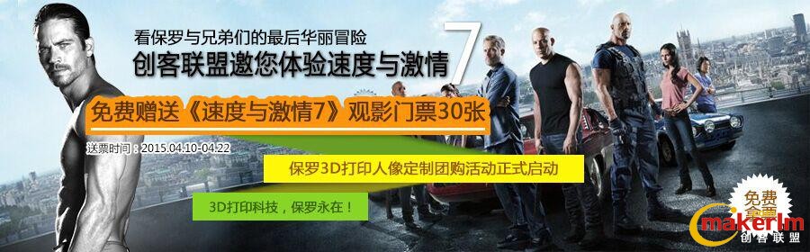 雖然《速度與激情》的靈魂人物保羅已離去,但不可否認這部大電影堪稱精品。作為新千年影片中壽命最長的一部,短短4天,《速7》全球票房已經突破4億美元。3D打印創聯君回贈各位同萌們看3D大電影,30張影票等你來拿。