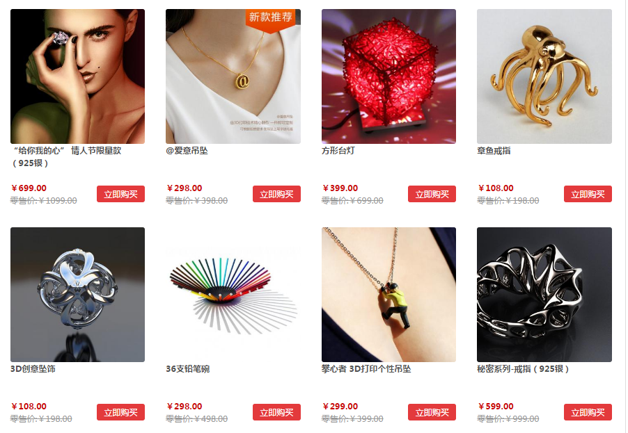 創(chuàng)客聯(lián)盟早已開展線上3D打印定制服務(wù),目前創(chuàng)客聯(lián)盟網(wǎng)上商城出售的商品已經(jīng)聆郎滿目,當(dāng)然也包括各種款式精美的飾品。并且,有興趣的朋友還可在創(chuàng)客聯(lián)盟開店——簡單而言,創(chuàng)客聯(lián)盟好比是中國3D打印界的淘寶。在國內(nèi),如果您也想定制一款3D打印珠寶或別的物品,何不來創(chuàng)客聯(lián)盟?